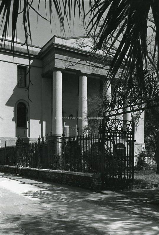 a: View of the south (rear) elevation from the Meeting Street sidewalk. Iron gate and fence to Washington Square Park in foreground.
