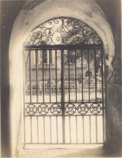 Photograph (scan) of the gate in the Fireproof Building (100 Meeting Street), looking out.Photograph Details
