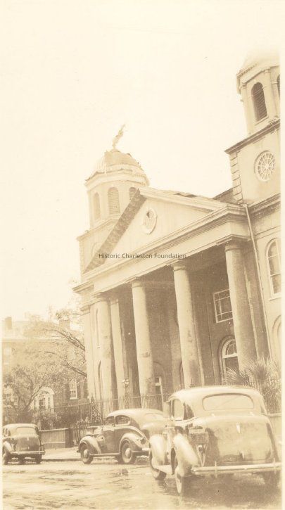 Silver gelatin photograph of First Scots Presbyterian Church after the tornadoes of September 29, 1938, showing the damage done to the building. The Nathaniel Russell House can be seen in the background. Cars are parked on street in front of the church.Photograph Details