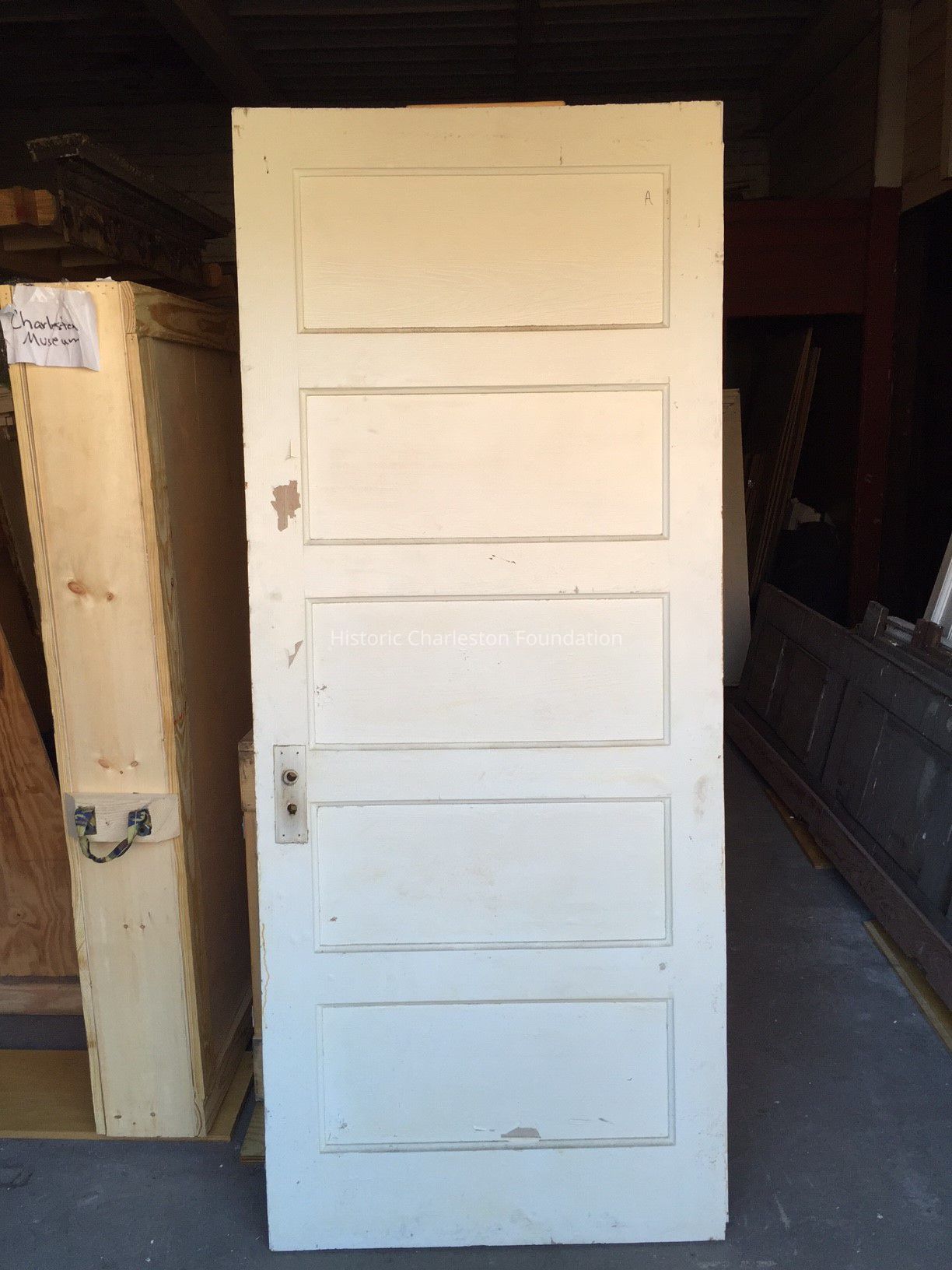 One of three 5-panel oak doors originating from 517 Huger Street.