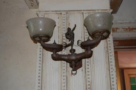 One of a pair of gas wall brackets, this one depicting the figure of Mercury, c. 1857-1859. Heavy Base with Rear Projections For Attaching To Wall and Side Arms To Hold Decorative Gas Fixtures. Brass Finial At Bottom with Ring Attached At the Center of the Intersection of Arms Andrear Projection. Above the Lower Finial Is a Round Pedestal To Which a Small Brass Figure of a Male Figure Is Attached, Staniding on One Leg with Other Leg Raised Behind Him As If Running, in Left Arm He Holds a Bow (Missing) and Has a Quiver of Arrows Behind Him. Draped Fabric on the Cord From the Quiver of Arrows Crosses the Front of the Body. Outside Edge of Each Side Arm Supports a Brass "Aladdins" Lamp with handle at rear and gas jet at spout. Pressed brass globe holder with 3 screws. Floral back plate of cast brass.Collection