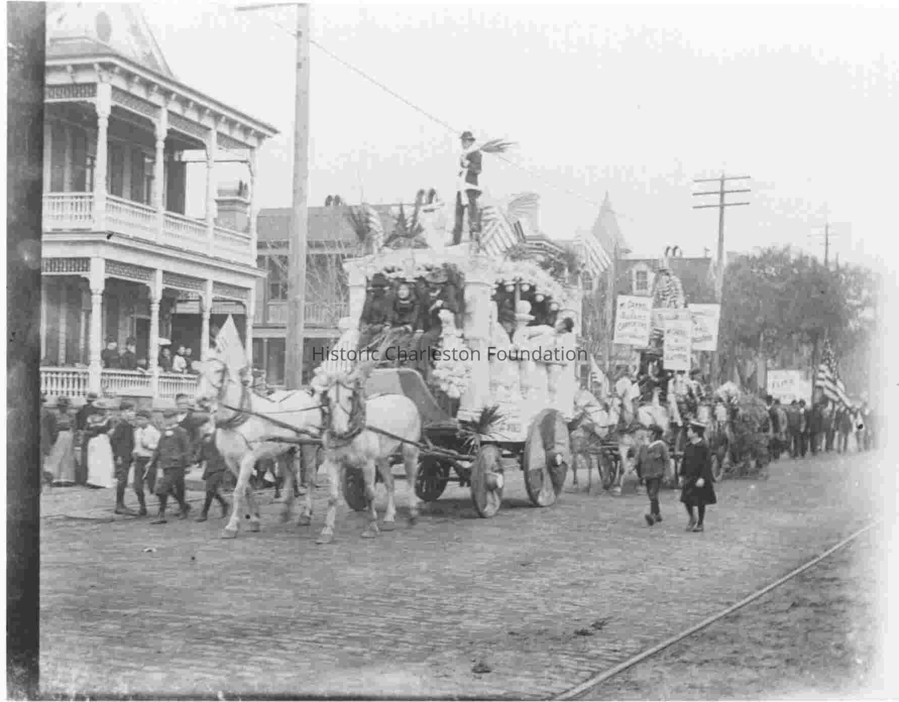 Photo is identified as the "Float Parade," opening day of the SC and West Indian Exposition, 1901-02. Horse-drawn floats move down the street.Context