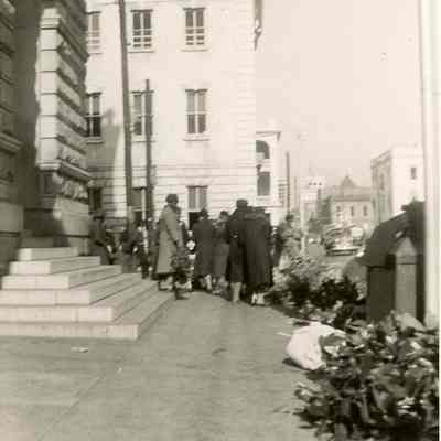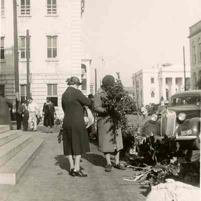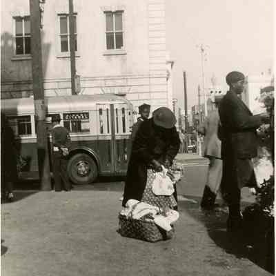 Four B&W photographs of women selling flowers at the Four Corners of Law/Civic Square at Meeting and Broad Streets. Also shows the activity of a busy intersection (pedestrians, cars, buses). Photographer unknown.Collection