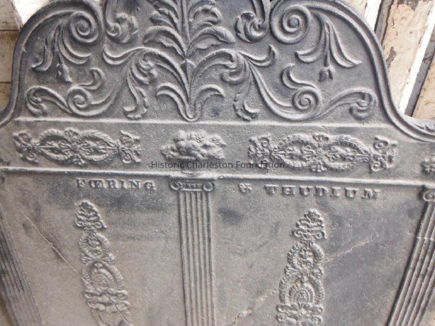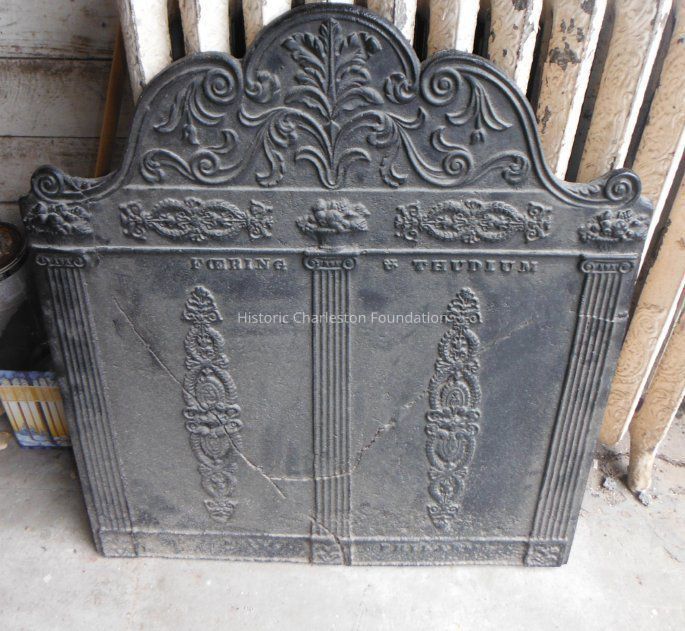 Cast iron fireback with decorative ornamentation. Manufactured by Foering & Thudium, Phila[delphia] [cast on front]. Roman numerals at bottom left are not legible [stamped No. XX_____?]. Measures 37.5" wide; 30.25" at highest point (center); sides are 23.75" high. Has Y-shaped crack that has been repaired.
