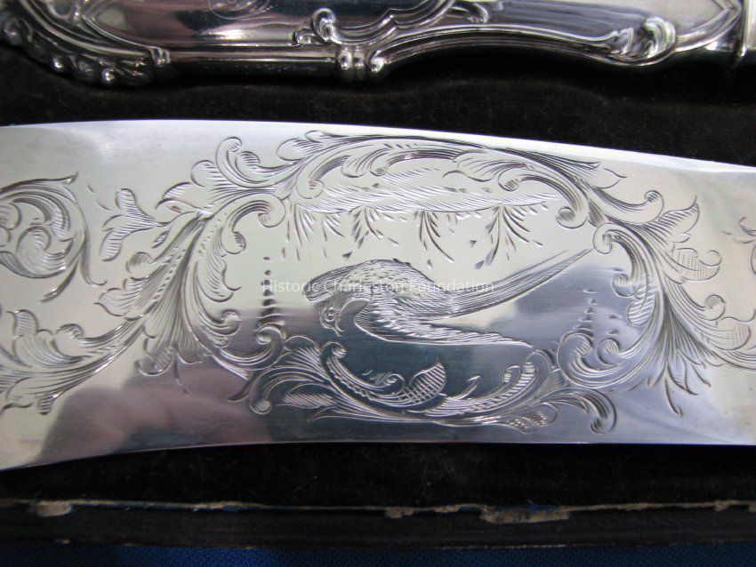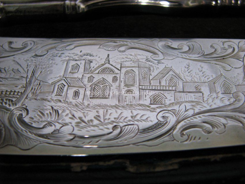 Silver Fish slice , Gothic shaped handle, engraved blades with landscape decoration, handles engraved with initials 'HR.' Stamped with maker's mark WG&S, pat. 1847, William Gale and Son, New York, in own box.Collection