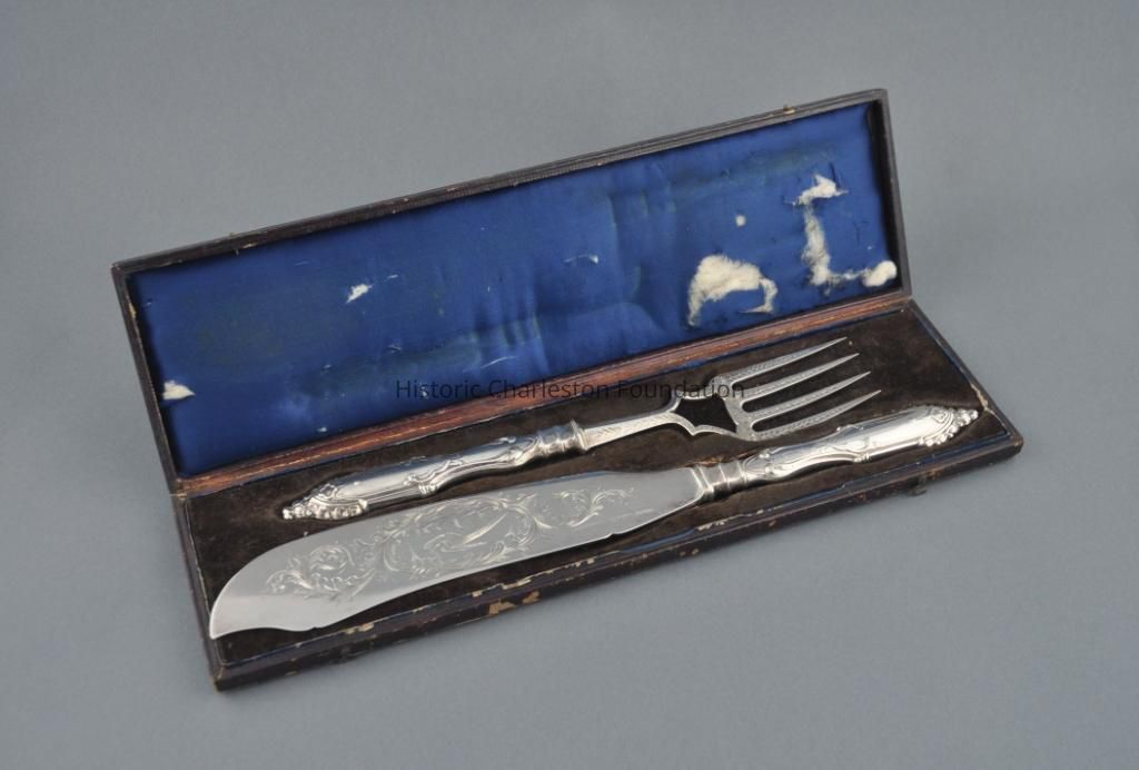 Silver Fish slice and fork, Gothic shaped handle, engraved blades with landscape decoration, handles engraved with initials 'HR.' Stamped with maker's mark WG&S, pat. 1847, William Gale and Son, New York, in own box.Collection