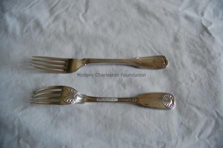 Twelve Luncheon forks, fiddle thread and shell pattern, engraved on back side of handle in script, initials RML. Stamped with hallmarks of rampant lion, W and head facing right in rectangular cartouch, not found.