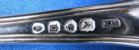 Kings pattern dinner fork made of sterling silver. Elaborate shell pattern with shells at handle. Four tines. Back of handle is engraved with Wyatt Crest ( impaled stag) above initials WHA. Makers mark W.T in rectangular cartouche. with lion, leopard, U and profile facing right. Rococo/ Empire, Maker is Walter Thornhill or William Theobalds.Collection