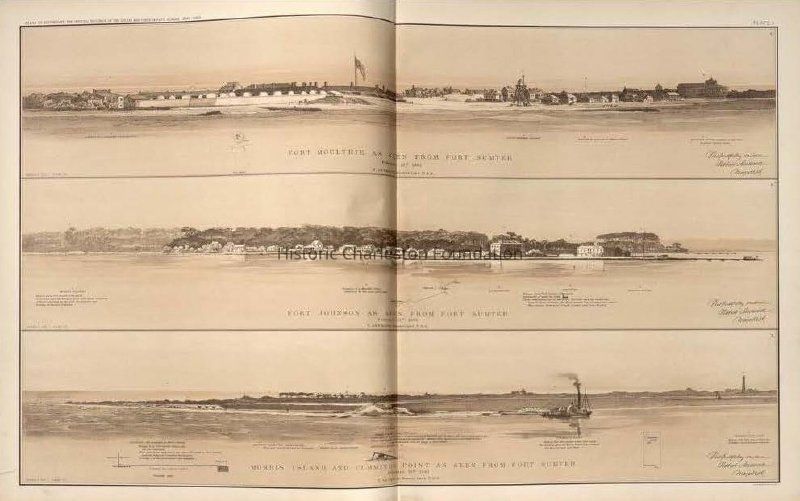 Three views: "Fort Moultrie as seen from Fort Sumter"; "Fort Johnson as seen from Fort Sumter"; and "Morris Island and Cummings Point as seen from Fort Sumter."