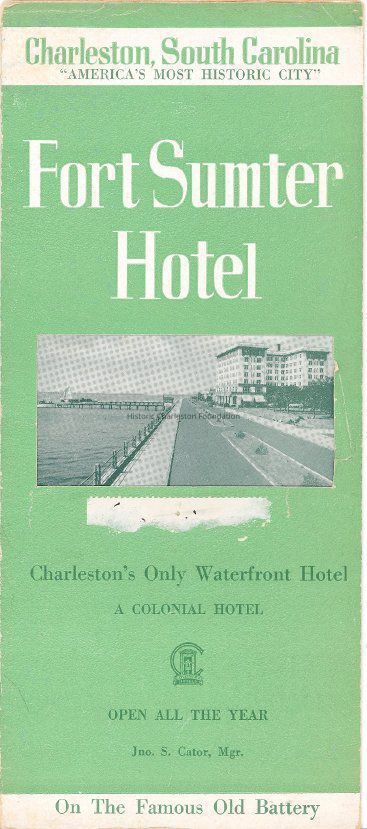 Brochure for the Fort Sumter Hotel, "located on the famous Old Battery at the foot of King Street...overlooking White Point Garden." Includes description and floor plan of the hotel, information about Charleston, and photographs of points of interest. Also includes map showing travel routes to Charleston from Jacksonville, Florida, to New York, New York. "A Colonial Hotel. Jno. S. Cator, Mgr." Illustrated with photographs of the Fort Sumter Hotel; Magnolia Gardens; Middleton Gardens; Cypress Gardens; Old Powder Magazine; The Pink House; Old Slave Market; Fort Sumter; the Battery; as well as a typical floor plan of the hotel and map featuring travel routes to Charleston.
