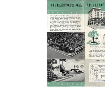 Scan of a brochure for the Fort Sumter Hotel, "Charleston's Only Waterfront Hotel on the Famous Battery at the Foot of King Street." (Jno. S. Cator, President.) Features a description and floor plan of the hotel, information about Charleston, and photographs of Fort Sumter, St. Philip's Church, Miles Brewton House, St. Michael's Church, Old Exchange Building, White Point Gardens, and an aerial view of the southeastern end of the peninsula. Photograph of the hotel taken from the river on front cover; photograph of the hotel viewed White Point Gardens on back cover. Also describes the accommodations ("European Plan").