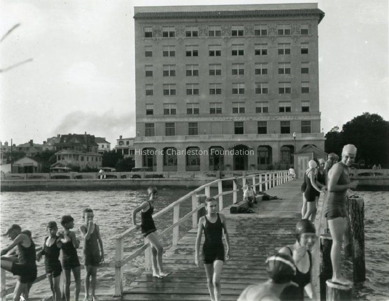 Reprint of a photograph showing a view of the south elevation of the Fort Sumter Hotel taken from across the Fort Sumter Hotel pier. Many swimmers are standing along the pier.
