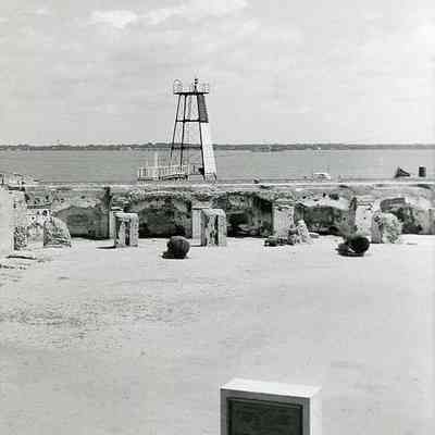 a: From description that was taped to the back (removed): "Remains of the Officers Quarters in the left foreground. In the center are the remains of a powder magazine. At right, the opening leads into a row of gun rooms. (Labeled as College of Charleston, photo FS--4, dated 2/13/1970.)