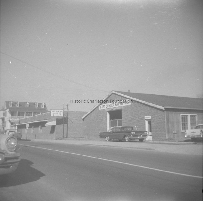 B&W photograph of the Fort Sumter Paper Co. (336 East Bay Street), showing west (front) elevation and a portion of the southwest corner of the building. 342 East Bay Street can be seen in the background at the far left of the photo. Cars parked at the building.