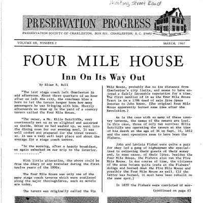 File contains Preservation Progress article about the Four Mile House associated with John and Lavinia Fisher (1967); research notes from Kevin Eberle about the location of the 4 Mile House associated with T.W. Mappus and the Mappus family (see images 1-2 in this record).