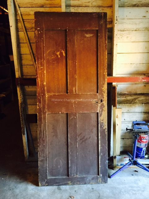 Four-panel door. Measures 77 1/8" x 31 ¾" x 1 1/8". Has faux graining under the top layer of paint. No hardware.