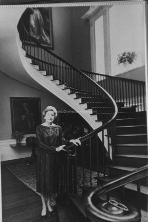 B&W photograph of Frances Edmunds standing by the Nathaniel Russell House staircase.Collection