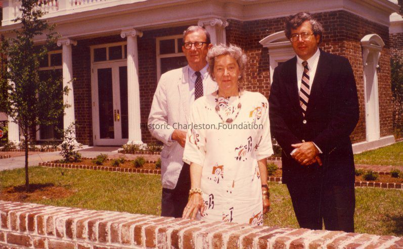 Color photograph of Frances Edmunds, Lawrence Walker, and Angus Murdoch standing in front of the Frances Edmunds Preservation Center at 108 Meeting Street.Collection