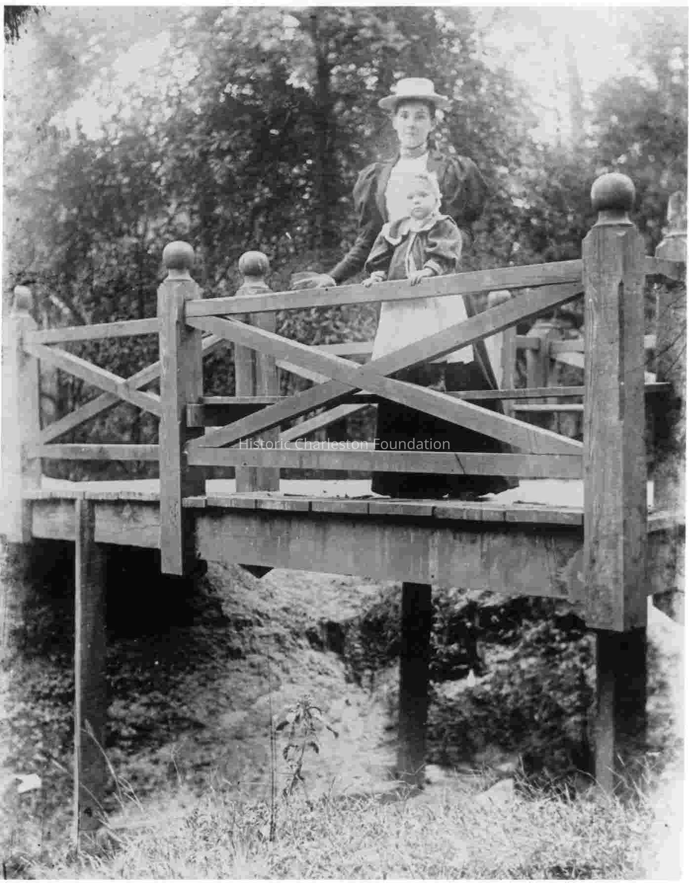 Young woman and small child stand on a pedestrian bridge. Photo is originally identified as Frances and Lizzie on bridge in Summerville.Collection