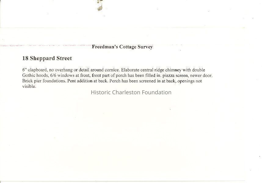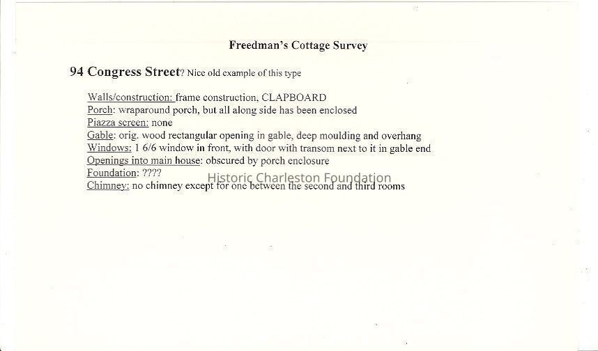 A house-by-house survey of freedman's cottages undertaken by HCF staff in 2000. Architectural details were recorded and photos taken of each house. Architectural details surveyed include: walls/construction; porch; piazza screen; gable; windows; opening into main house; foundation; chimney; presence of additions; and other miscellaneous notes about condition, etc. Surveys were done on these houses: