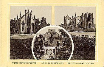 Images of three churches identified as French Protestant (Huguenot) (left), Circular Church yard featuring a tomb (inset, center), and the ruins of St. Finbar's Cathedral (right).Collection