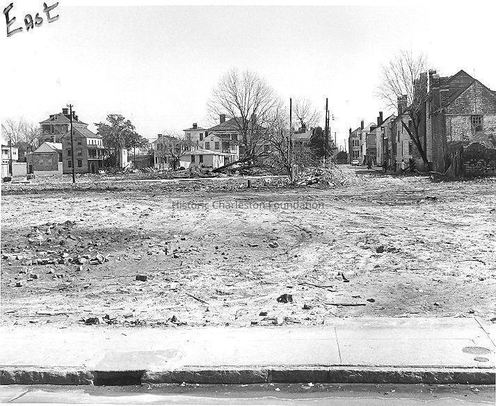 B&W photograph of the view looking east from Anson Street of the cleared site where the Charleston Municipal Auditorium (a/k/a Gaillard Auditorium) would be constructed. Surrounding houses that were spared demolition, or hadn't been demolished yet, are in the background. Appears to be a similar view as that in CALHOUN.GEN.05, showing some of the same buildings in the background.