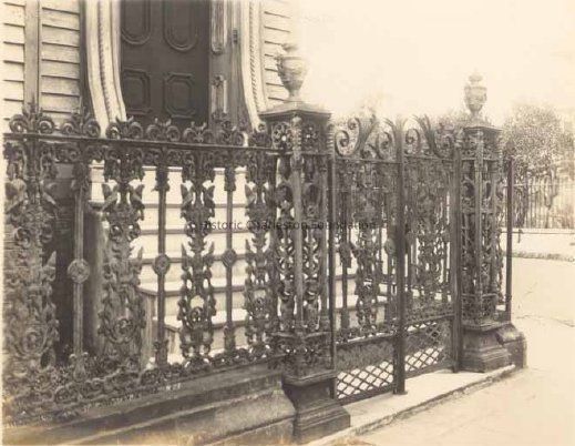 Scan of photograph of an ironwork gate and fence at the corner of Vanderhorst Street and Pitt Street.Photograph Details