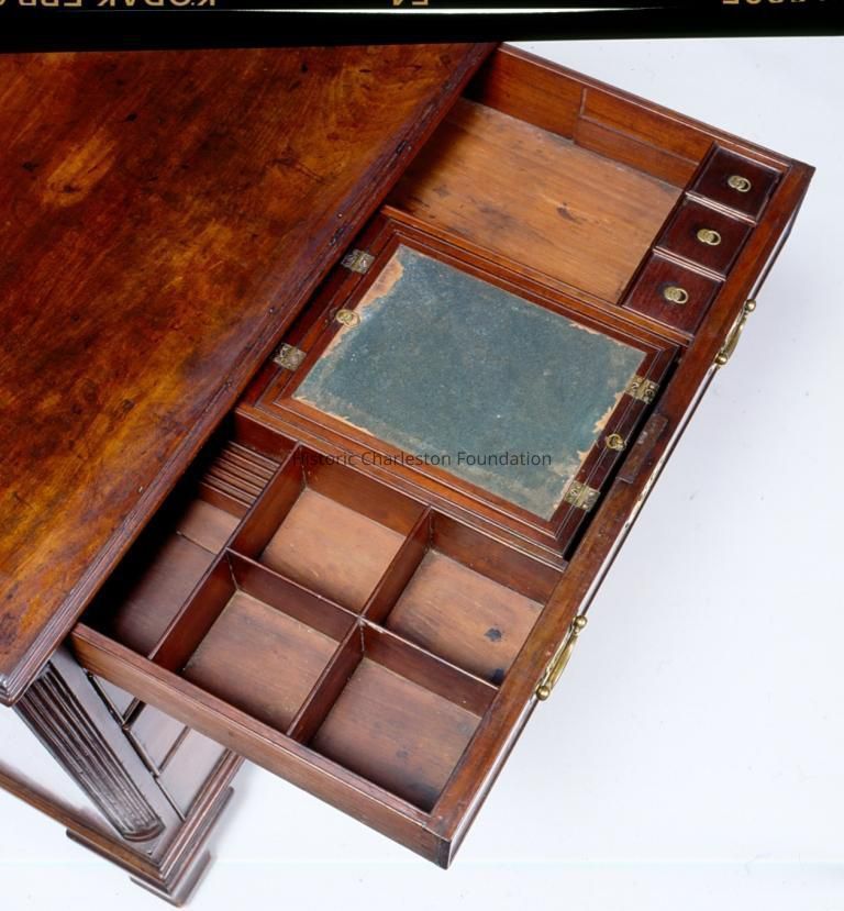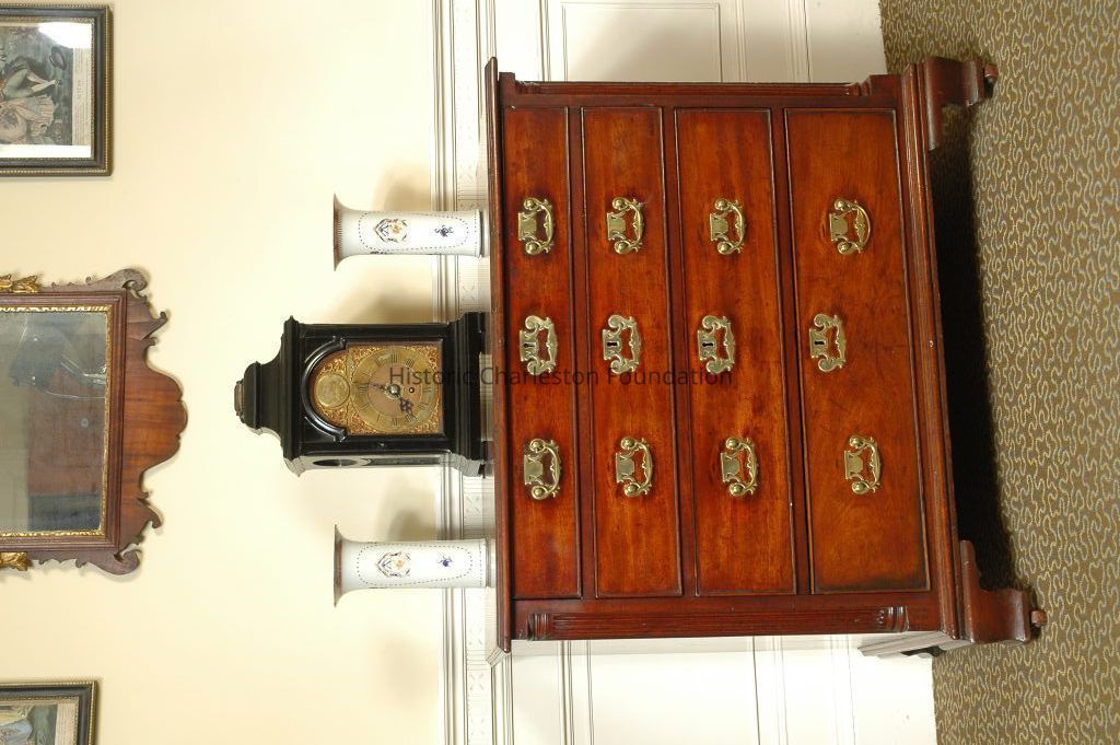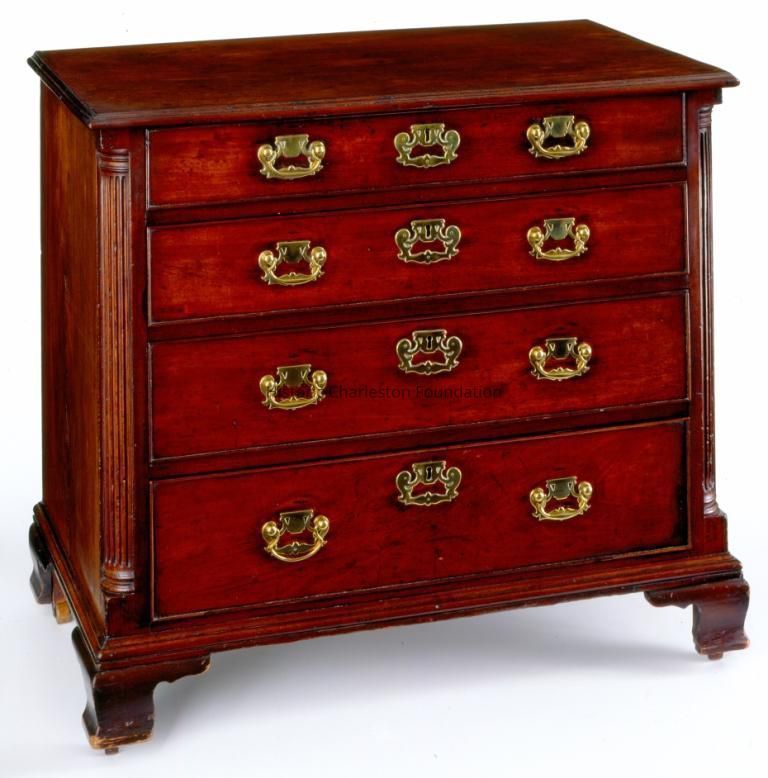 Chippendale Style Chest of Drawers , the Top with Molded Edge Over Four Graduated Drawers with Applied Cock-Bead Edges, The Case Decorated with Quarter Columns At Front Corners, the Whole Upon a Molded Base on Ogee Bracket Feet (Replaced?) on Casters. Original Brass Pulls and Escutcheons. the Top Drawer with Framed Mirror and Sectioned Compartments.Collection