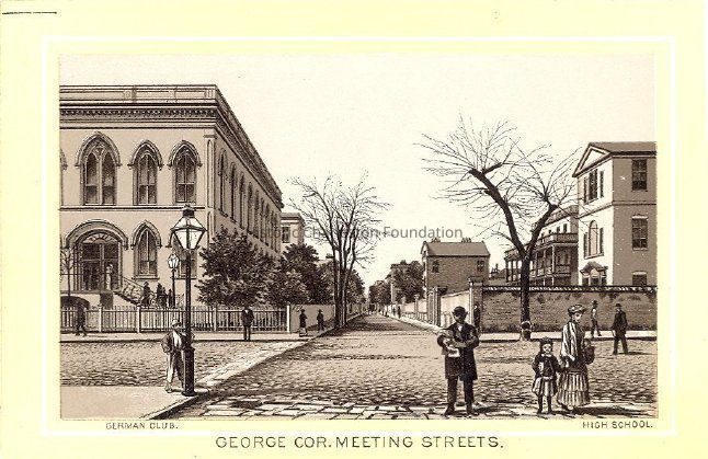 Corner of George Street and Meeting Street, looking west on George Street. Shows 287-289 Meeting Street (Der Deutsch Freundschaftsbund Hall) and ~22-24 George Street (Judge King House/Radcliffe-King Mansion and neighboring house, both demolished). Pedestrians on street. 287-289 Meeting Street is captioned "German Club" and George Street house is captioned "High School."Collection