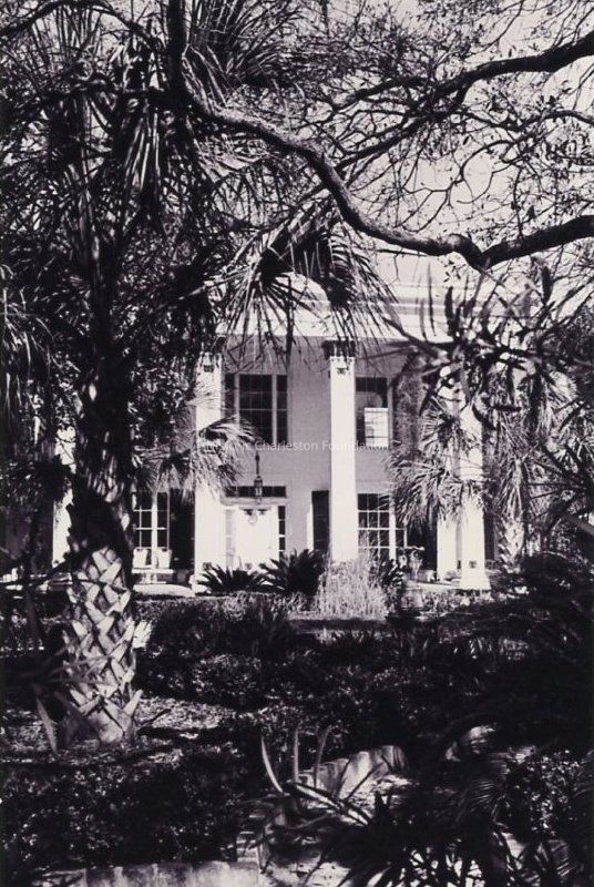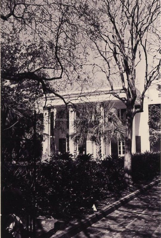 Two B&W photographs of the George Reynolds House (60 Hasell Street), south (front) elevation, slightly different orientations. Views are partially obscured by trees.Collection