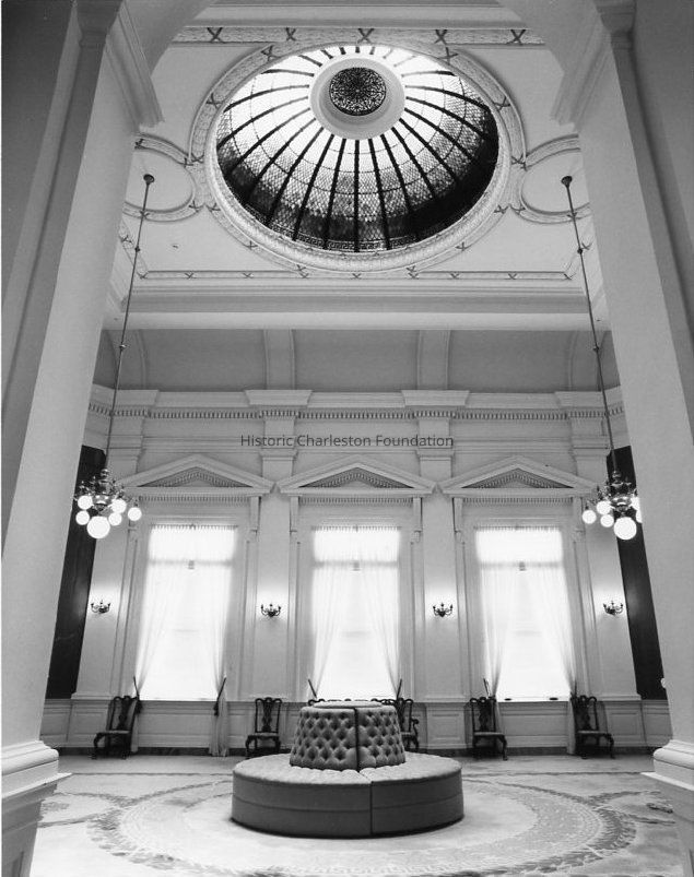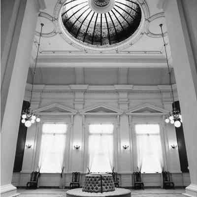 b: Interior. View of the stained glass dome and the Rotunda on the second floor.Collection