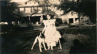 B&W photograph (scan) of a girl (member of the McInnes family) standing with dog, showing 518 Huger Street in the background, including the two-story garage and servants' quarters.Context