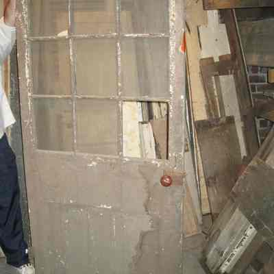 Glass Panel Door. 75.5"H x 34"W. Wooden door with 9 lights. 8 are intact. There are also two lower panels and a ceramic knob.