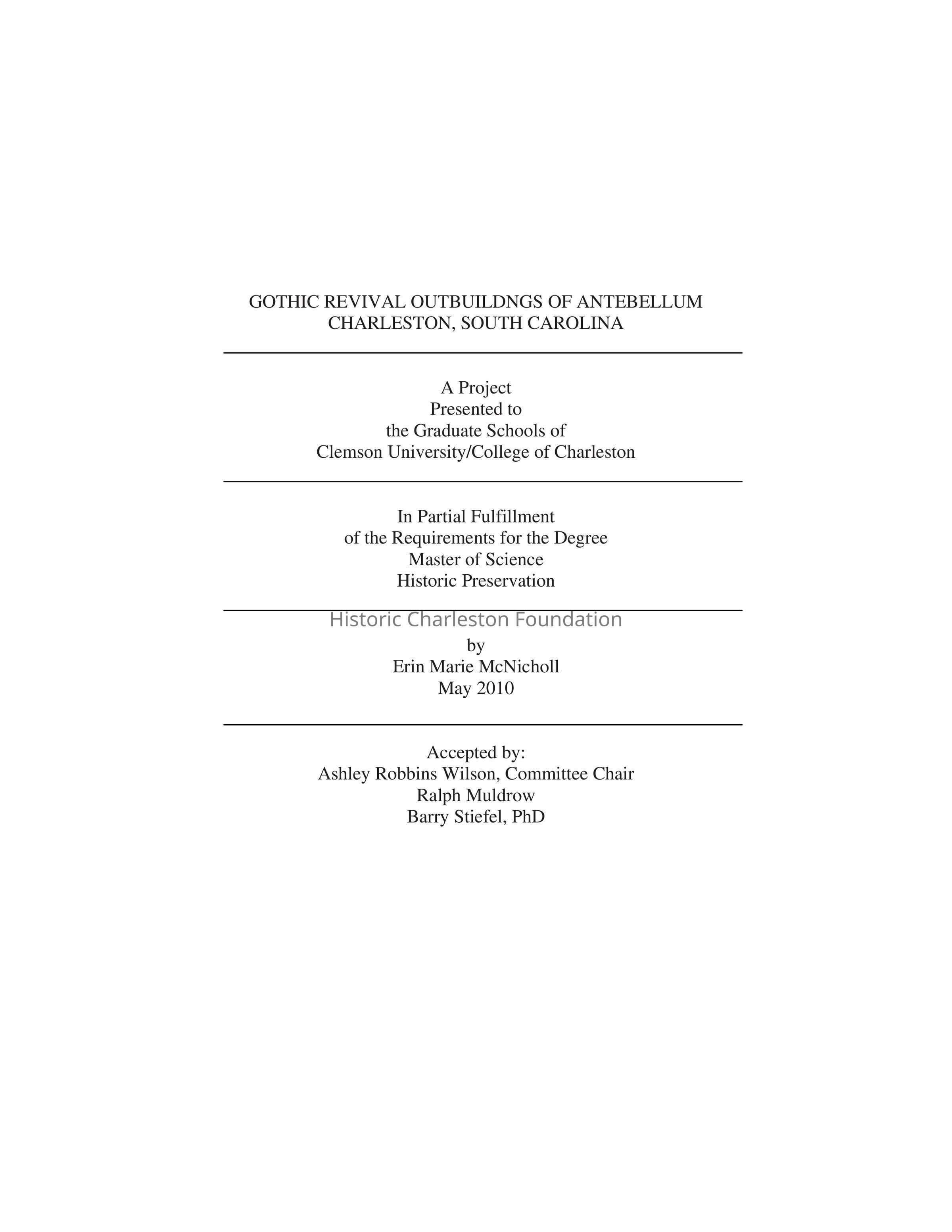 The Gothic Revival was a movement of picturesque architecture that is found all over the United States on buildings built in the first half of the nineteenth century. In Antebellum Charleston people tended to cling to the classical styles of architecture even when the rest of the nation and Europe were enthusiastically embracing the different picturesque styles, such as Gothic Revival and Italianate. In the United States the Gothic Revival style can be found adorning buildings of every use. One of the unique applications to be found is on kitchen buildings and carriage houses. These applications exhibit traits of an early form of the Gothic Revival with simple ornamentation and symmetrical design. Many people have associated the use of Gothic Revival architecture in Charleston with slavery because of its application to small outbuildings and certain institutional buildings around the city. The conclusion of this thesis is that the Gothic elements were by no means limited to buildings with uses associated with slavery but rather an expression of the architectural fashion of the time. This project documents the Gothic Revival outbuildings in the context of the Gothic Revival movement nationally, regionally, and locally. It profiles existing examples of Gothic Revival outbuildings in Charleston. There is some investigation of how the Gothic Revival was used on plantations in addition to its use in the urban setting. Documentation drawings of the Aiken-Rhett House outbuildings, Bleak Hall Plantation icehouse, and William Blacklock House carriage house are included in an effort to provide a greater understanding of the unique applications of this style.