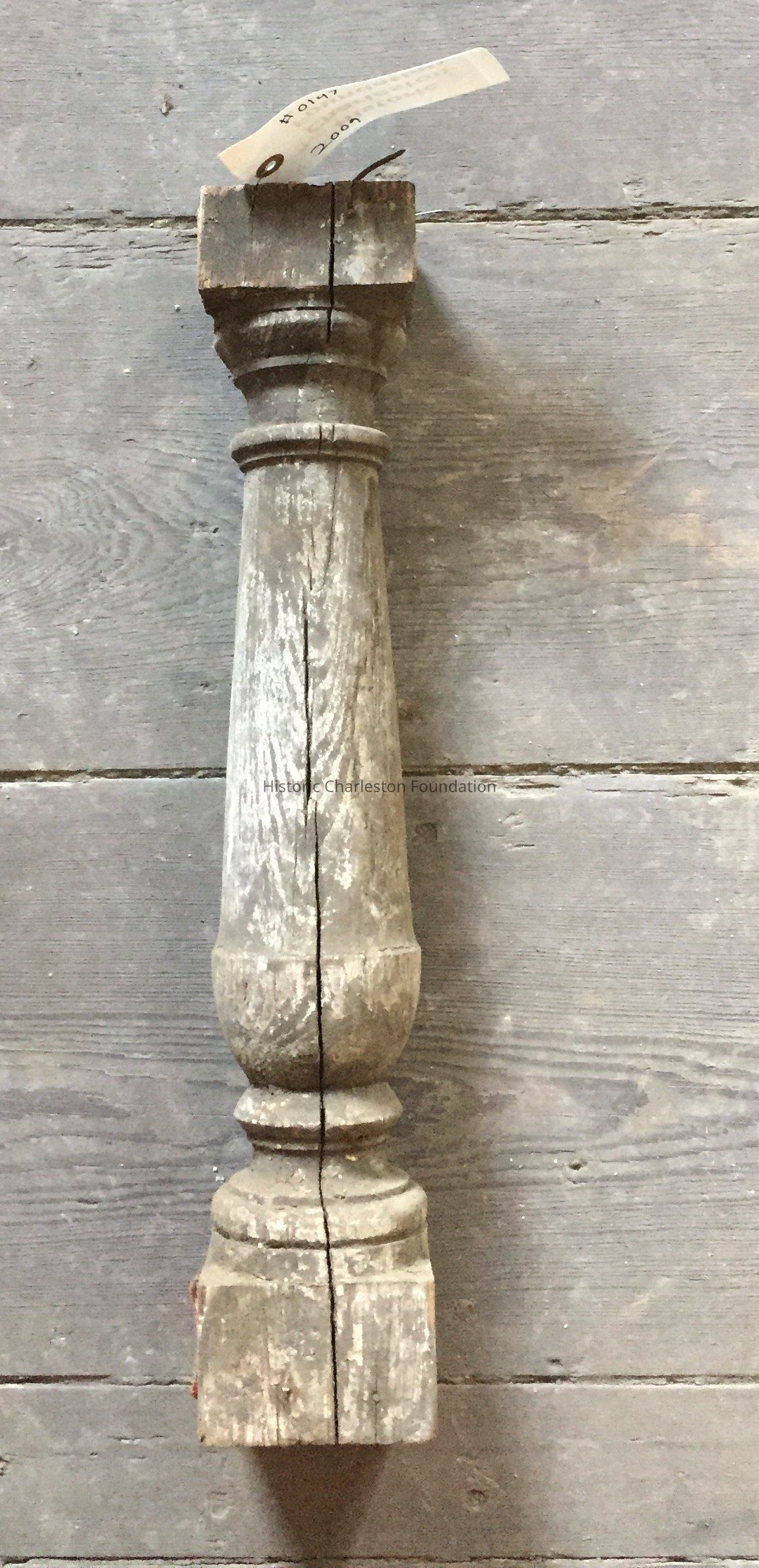 Greek Revival spindle, with interesting vase motif in turning. Some damage; has some rotting and a large crack running up the middle.Collection