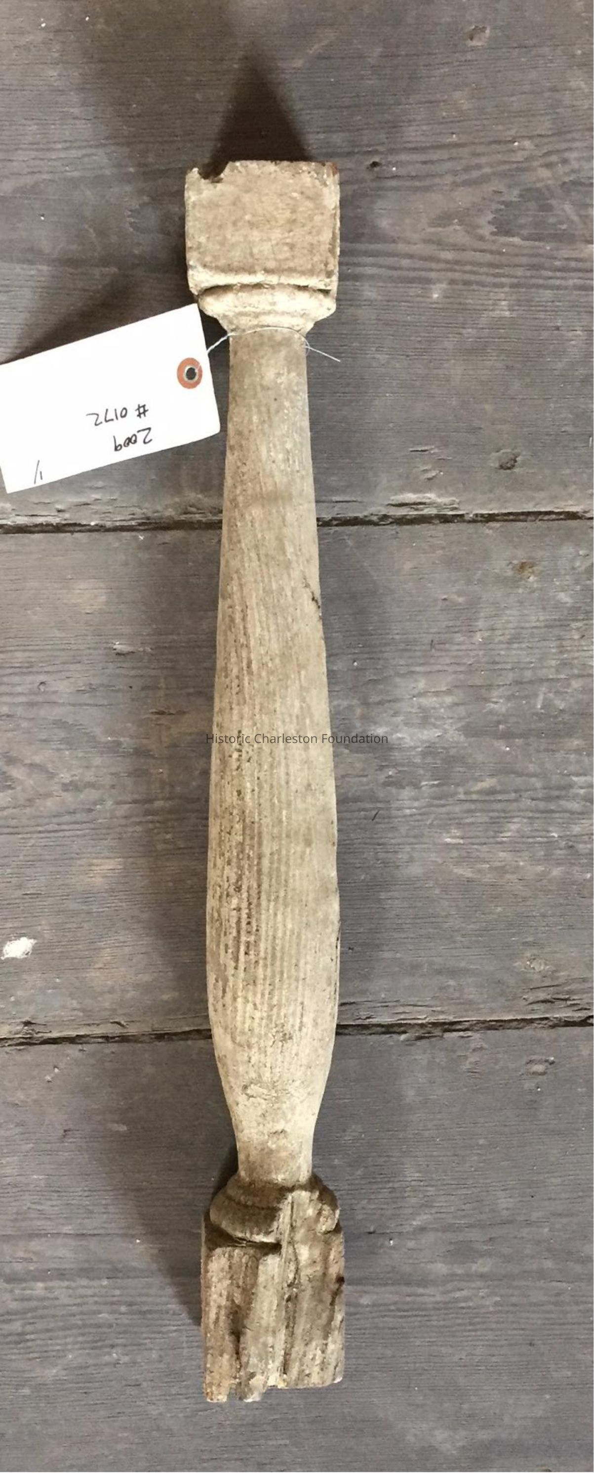 Greek Revival spindle. Has rotting, with pieces and paint chipped off.Collection