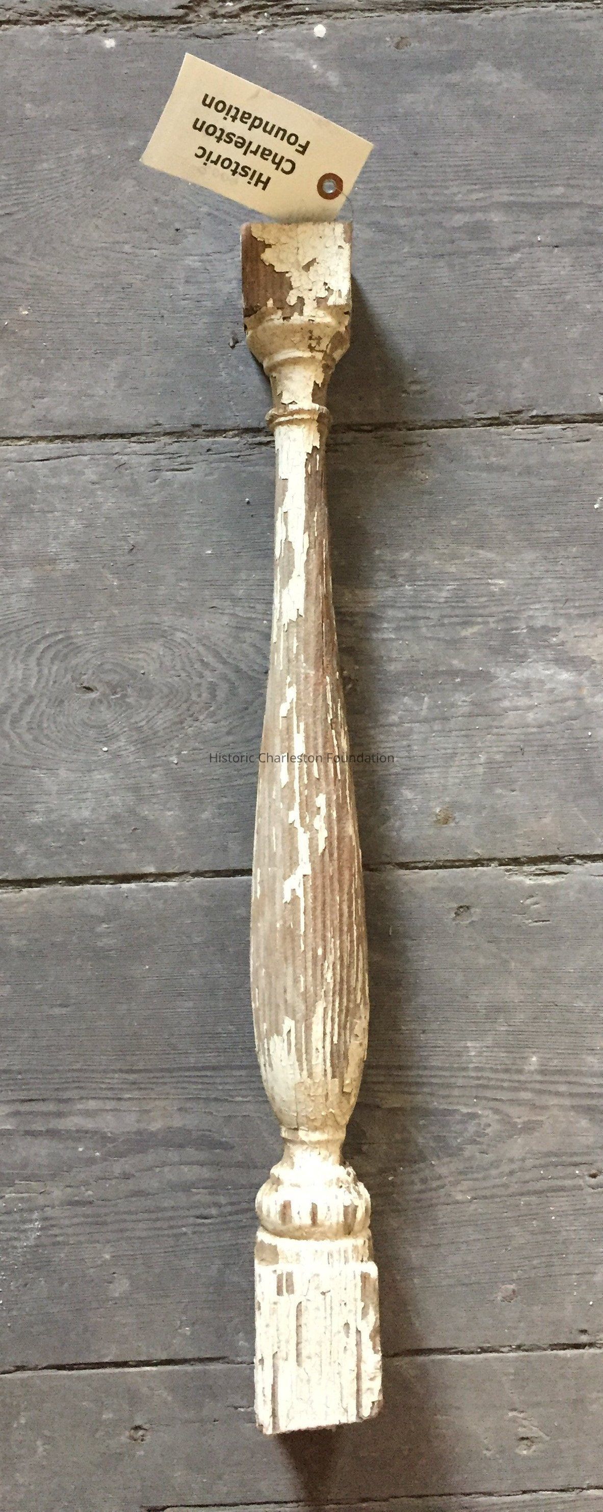 Wood spindle with white paint. Greek Revival, ca. 1820-1840. Most of the paint has cracked off. Looks to be fluted but could be a result of rotting.Collection