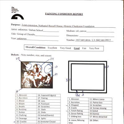 Frame: Good, general cracks/wear throughout, gilding discolored with losses throughout; 4 corners v. slightly separated; two "dings" at bottom left corner.Conservation