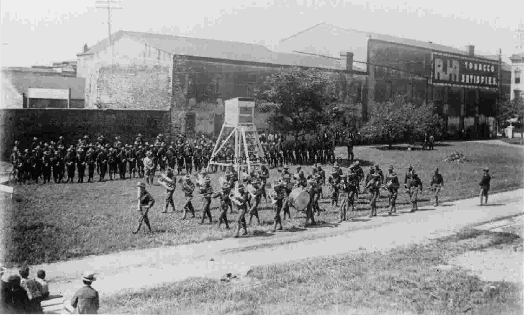 Identified as Spanish-American War Guard Mount. Soldiers marching band. Billboard/sign in background that says "RJHR Tobacco Satisfies."Collection