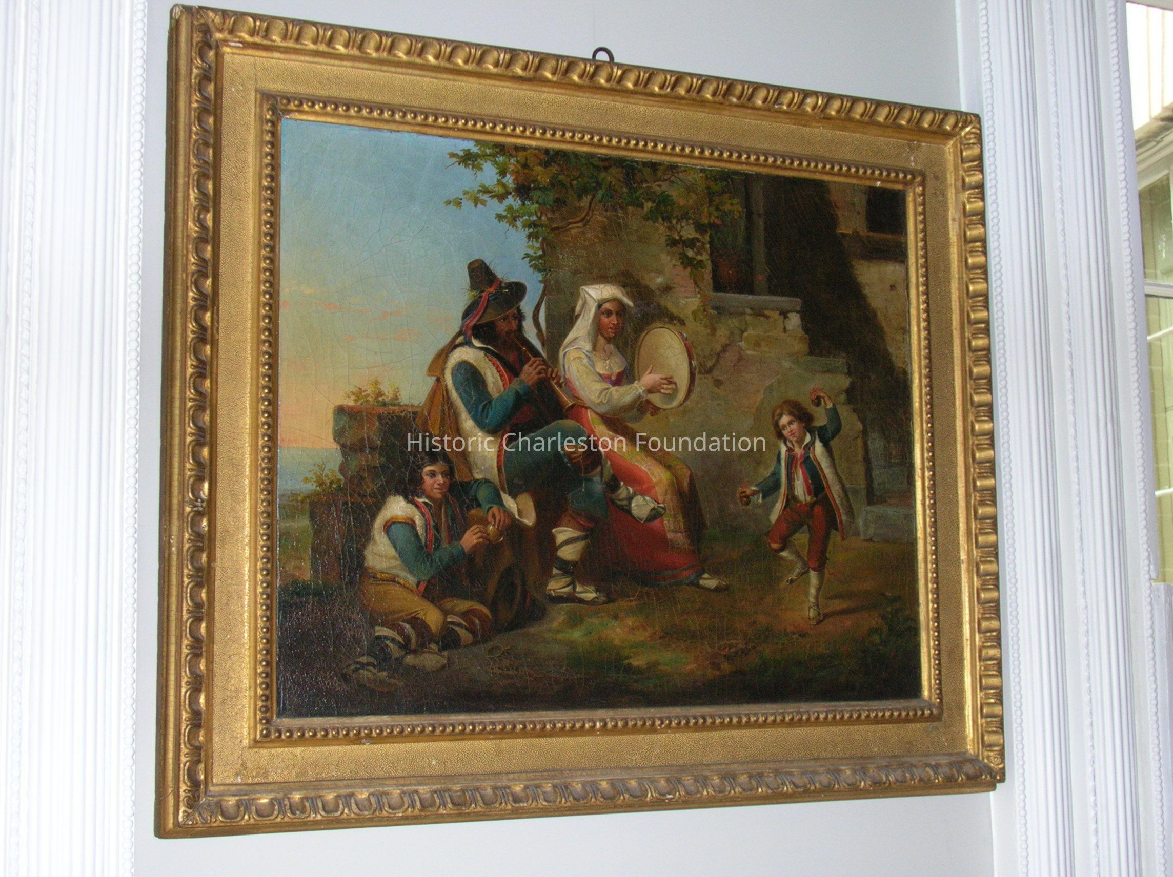 Genre Scene, Oil on Canvas, Italian c. 1815 of a Family with Musical Instruments. In Center a Seated Man with Recorder and a Seated Woman with Tamborine. At Left, a Boy Is Seated on the Ground. Another Boy Dances At Right. Background of Stuccoed House with Steps At Right, Water At Left. Marked on Back "a Marzanti, Fecit De Vita L'Anno 1815."Collection
