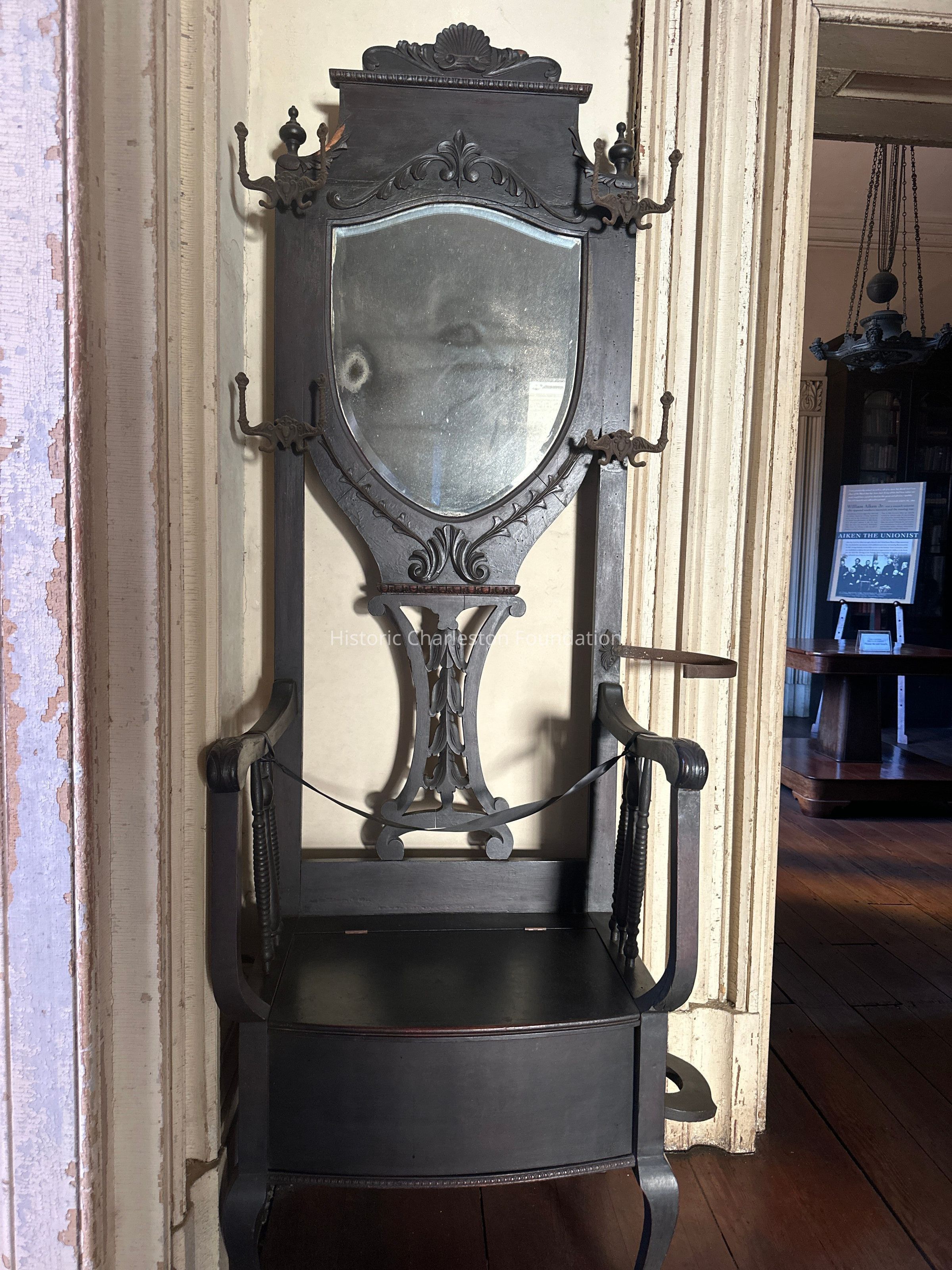 High back w/ shield shaped mirror at center. Applied floral carvings above and below mirror and shell carving on top pediment. Four cast iron coat hooks- two per side of hall rack. Turned finials at upper corners. Chair height seat forms base with hinged lid concealing a storage compartment. High shaped arms with three turned spindles at center. Shaped front post forming a "flat" surface cabriole leg on bottom and curved arm support above seat. Front surface of storage compartment is convex. Metal bracket attached to right side above arma nd wood bracket attached under seat intended for use as umbrella or cane storage. Drip pan missing from bottom bracket.Collection