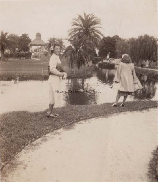 Photograph of two women standing by the pond at Hampton Park.Collection