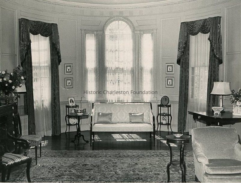 B&W photograph of the drawing room of the Heyward House (31 Legare Street). Palladian window at center (rear) of photo.