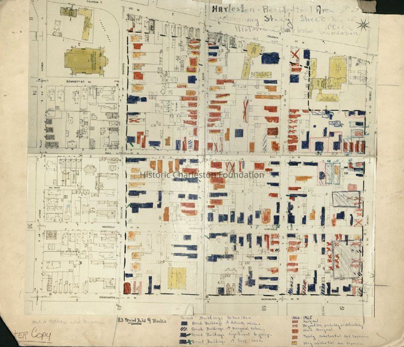 Copy of a Sanborn Map hand-colored and annotated for use by Historic Charleston Foundation to study a residential area in Harleston Village (area bounded by Calhoun Street, Coming Street, Wentworth Street, and Ashley Avenue).