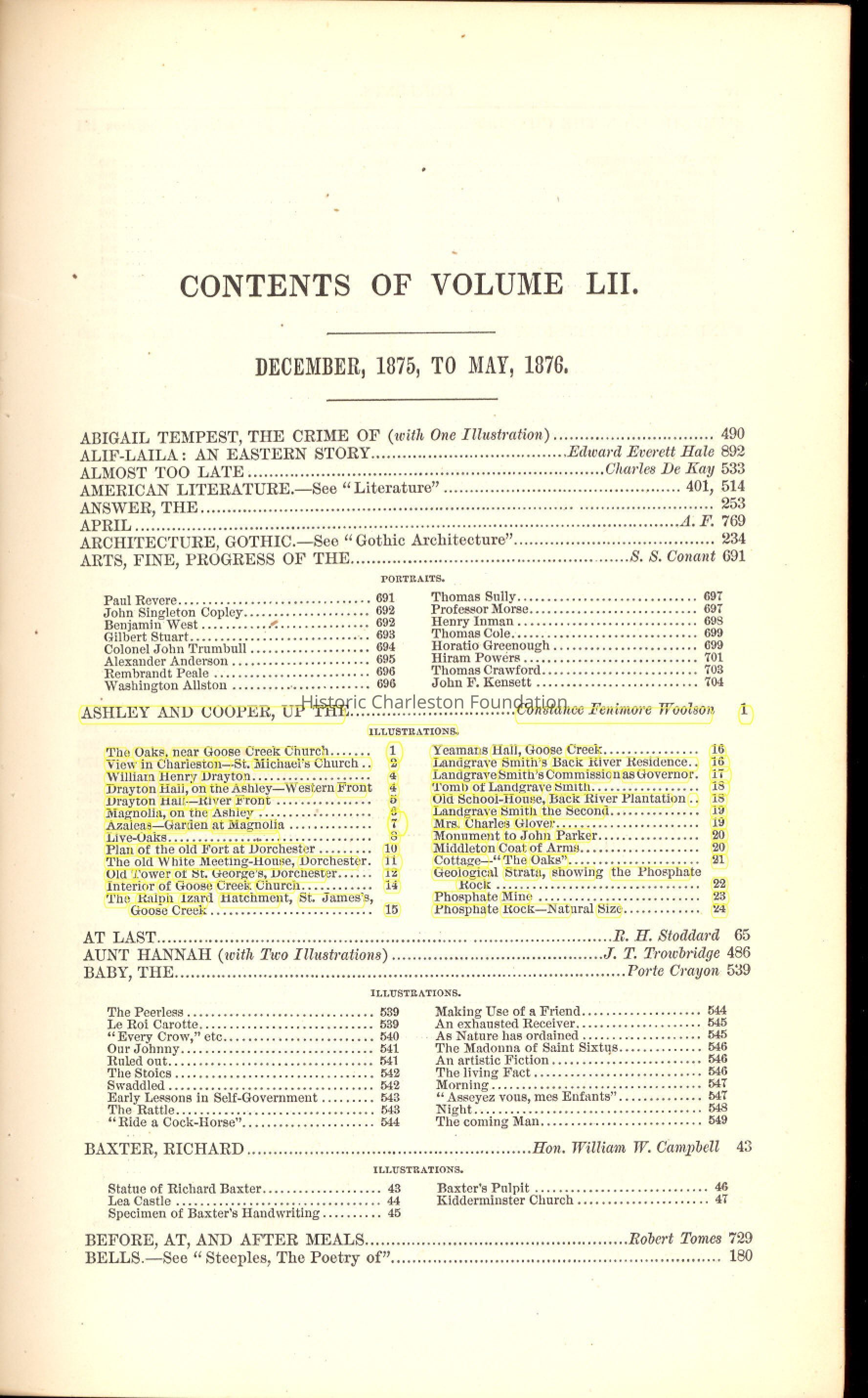Bound volume (vol. LII) of issues from December 1875 to May 1876. Contents include "Up the Ashley and Cooper" by Constance Fenimore Woolson, that features several aspects of Charleston and the vicinity, indlucing illustrations, and "Dwellings, Modern: Their Construction, Decoration, and Furniture" by H. Hudson Holly.
