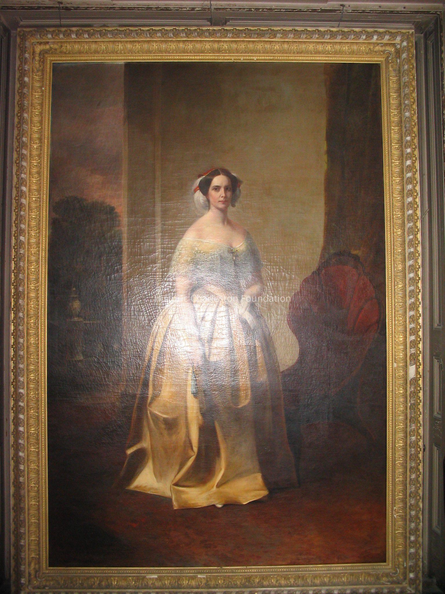 Full Length Portrait of Woman in Off the Shoulder Gold Satin Dress with Fine Lace Collar with Gold and Pearl Brooch At Center. Sitter Holds One Lace Edged Glove in Gloved Left Hand. Other Arm At Rest with Folded Fan At Wrist. Sitters Dark Hair Is Pulled Back and Ornamented with Plumes. Sitter Stands on a Figured Wool Carpet with a Shell Back Red Velvet Chair At Her Side. There Is a Table Painted Out of the Portrait. Green Drapery Hangs Behind the Chair and a Rural View Is Visible To the Background on the Left. in Somewhat Worn Gold Frame Ornamented with Scrolls and Floral Patterns.Collection