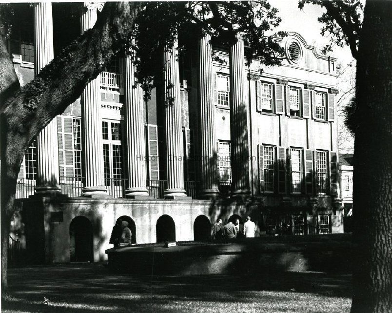 Typed label on back states: "The main building at the College of Charleston, chartered in 1785, the first municipal college in America. In recent years the college has undergone an extensive expansion program which, through adaptive use of many old houses and buildings in the area, has preserved and revitalized one of Charleston's important early neighborhoods."