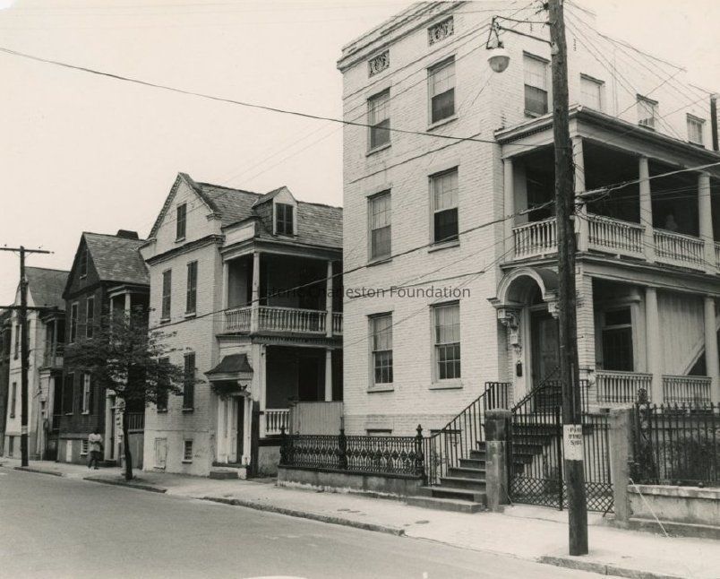 B&W photograph of Hasell Street houses, looking east from 35 Hasell to 29 Hasell. Features (L to R) 29 Hasell, 31 Hasell, 33 Hasell, and 35 Hasell.Collection