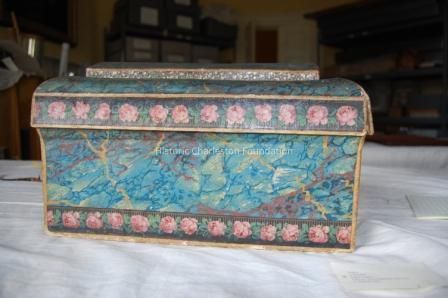 Rose border at bottom of box and on the lower band of the lid - pink roses with green leaves on a black ground with brown lines to create the illusion of gross-grain ribbon. Body of box is marbelized - blue ground with yellow, white, red and green veining throughout. Corners of box are delineated with gold lines. Lid has a raised, curved section, with the end pieces painted to look like the cross-section of marble, white interior.Collection