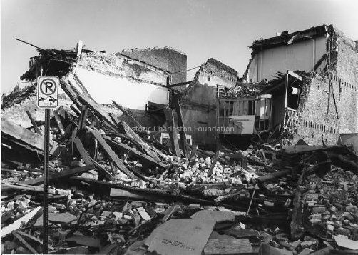 B&W photograph of a Hayne Street building destroyed by Hurricane Hugo.
